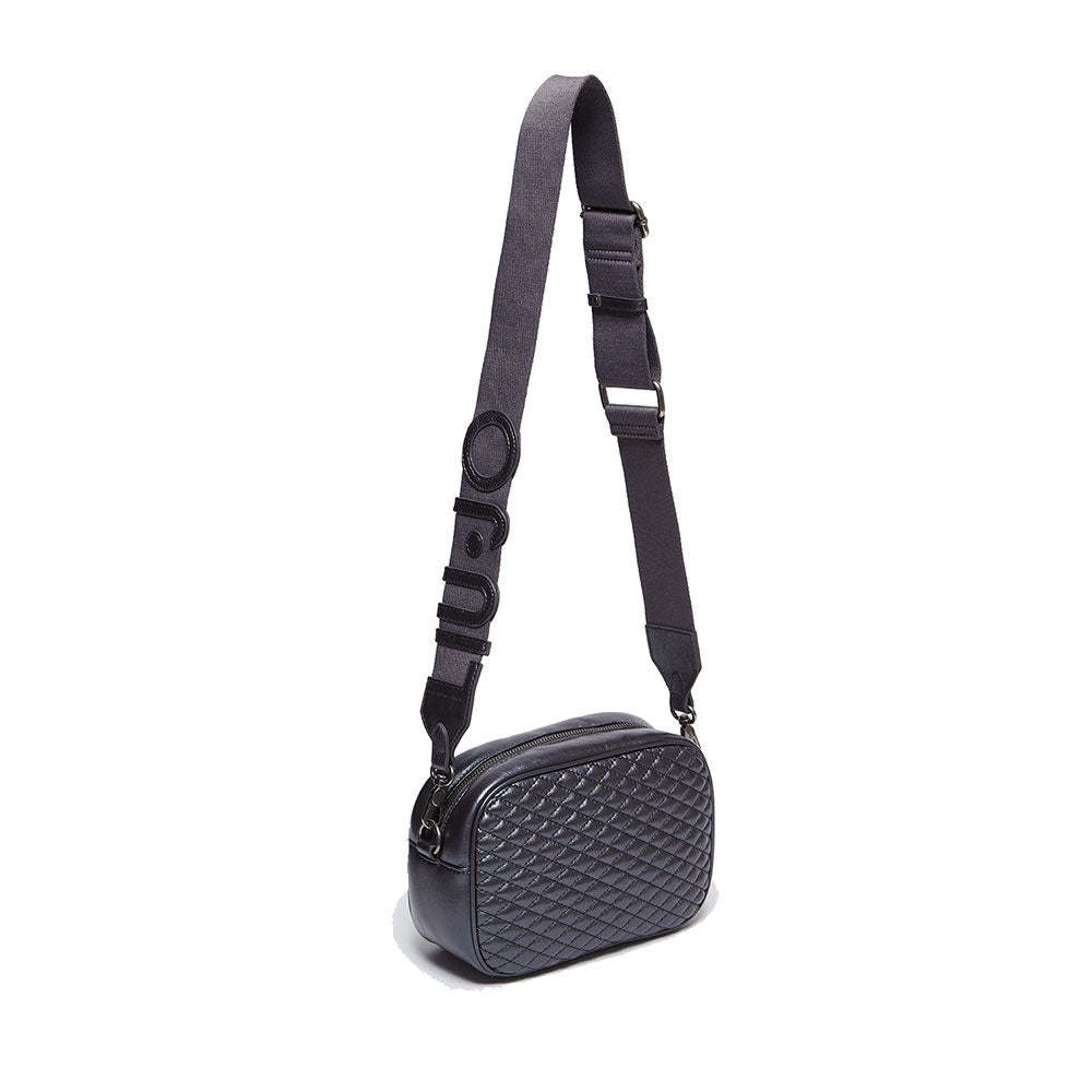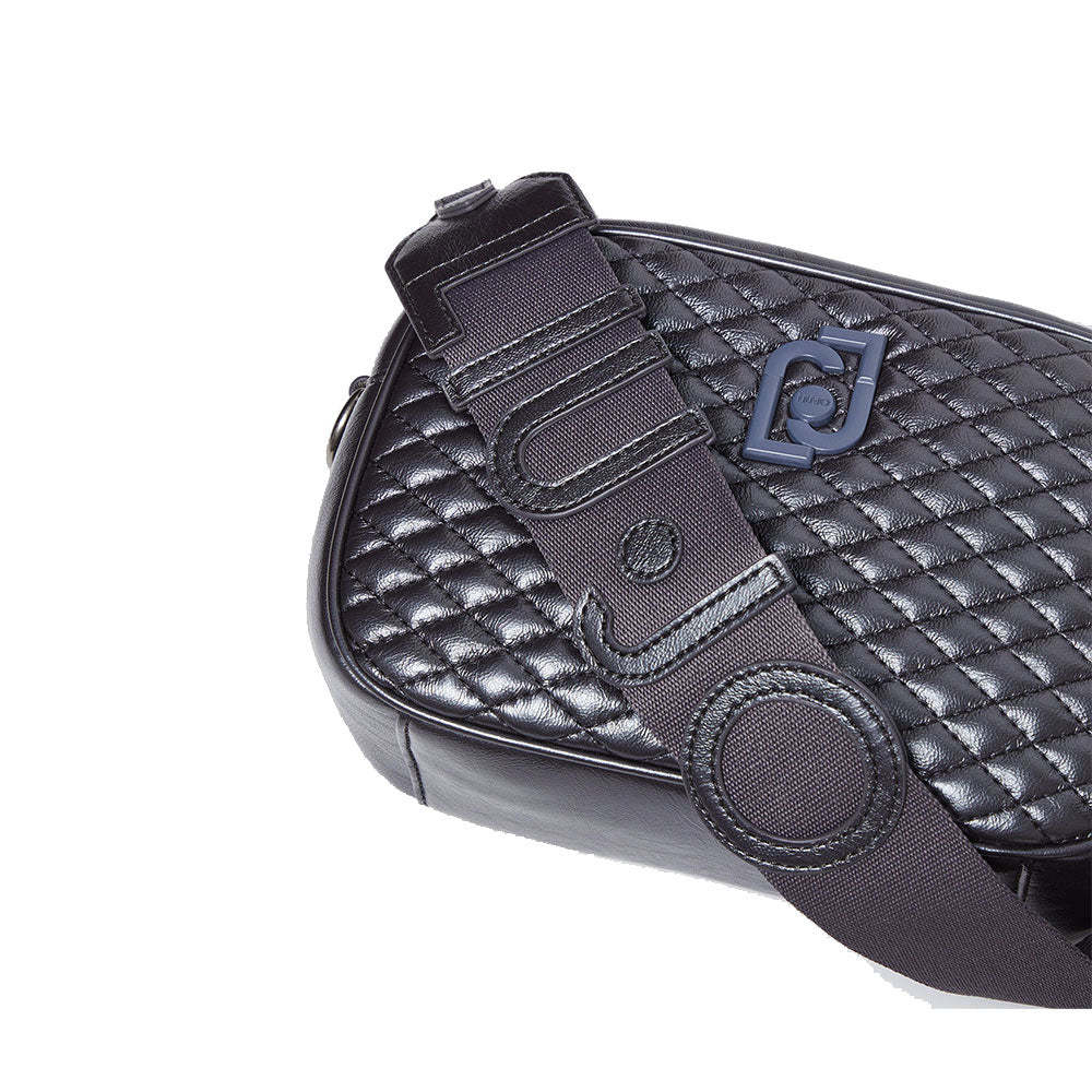 Borsa a tracolla in ecopelle matelassé lucida, chiusa con zip. Lettering LJ in metallo smaltato sul davanti. Charm rimovibile. Tracolla logata regolabile e rimovibile in gros grain. Prodotto "Liu Jo Better".