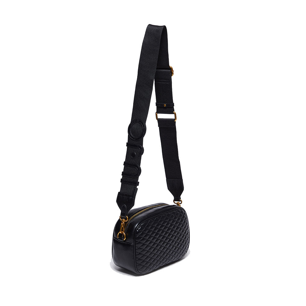 Borsa a tracolla in ecopelle matelassé lucida, chiusa con zip. Lettering LJ in metallo smaltato sul davanti. Charm rimovibile. Tracolla logata regolabile e rimovibile in gros grain. Prodotto "Liu Jo Better".