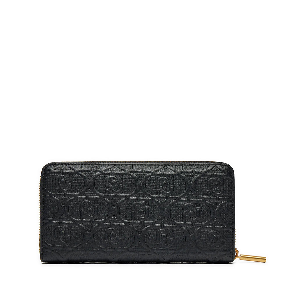Portafoglio grande zip around in ecopelle con logo monogram all over in rilievo. Fodera interna con logo. Logo in metallo sul davanti. Prodotto "Liu Jo Better".