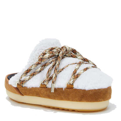 Contraddistinto da una silhouette completamente rinnovata, l'originale Icon Mule è pensato per affrontare con stile sia le strade cittadine che i sentieri innevati. Il design leggero e flessibile è ispirato a una slide, ma non mancano gli iconici dettagli del Moon Boot originale, come i lacci a incrocio, la suola antiscivolo e la calda imbottitura isolante. Questa versione è proposta in morbida pelle scamosciata e shearling.